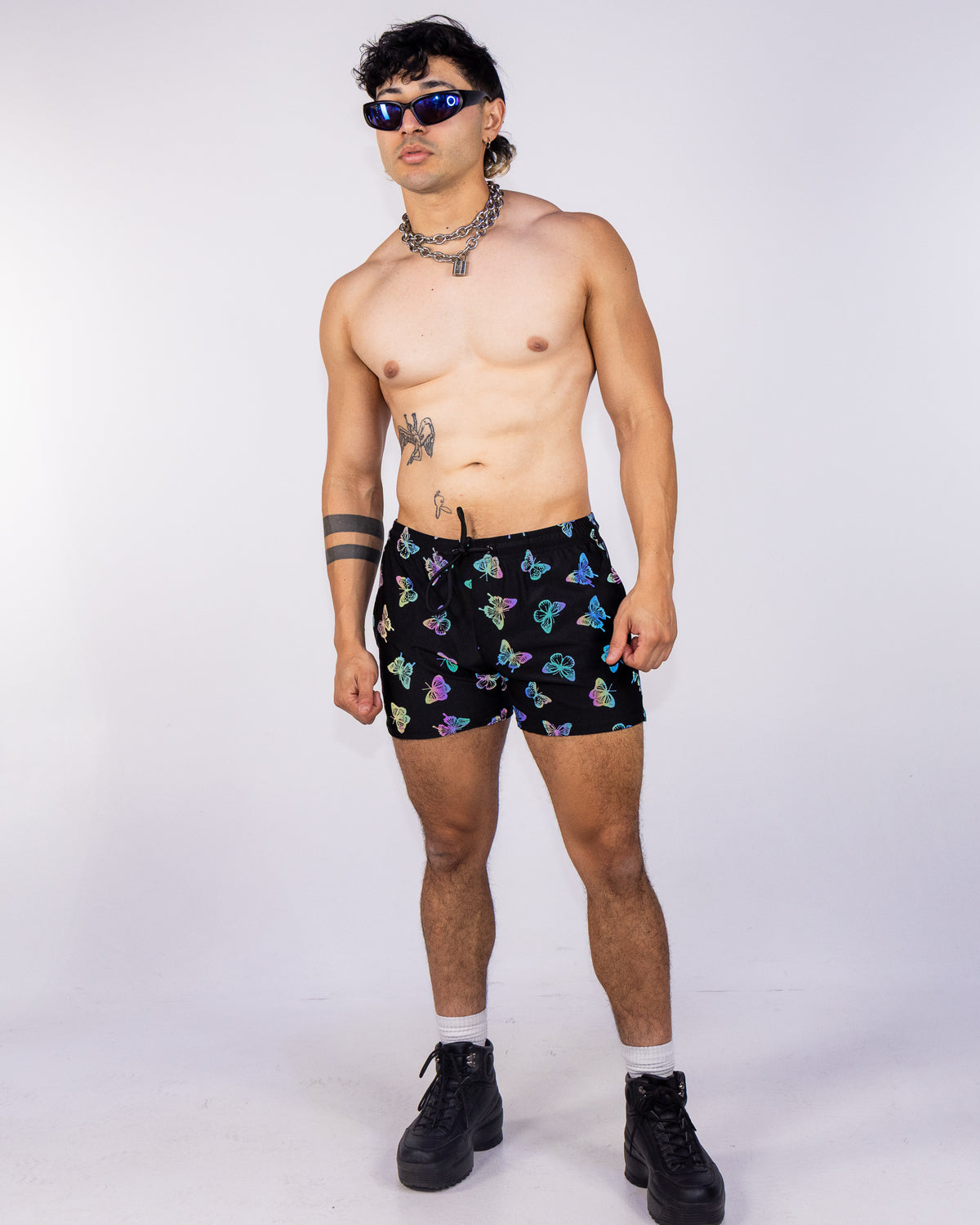Stand out from the crowd and take on any rave or festival in our Rainbow Flash Reflective Butterfly Drawstring Shorts! With reflective material, you'll be sure to catch everyone's eye and add some excitement to your outfit. Don't blend in, make a statement with these bold and adventurous shorts.