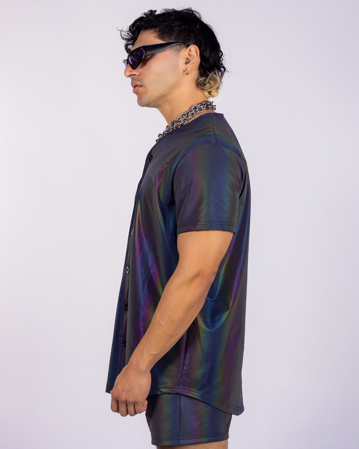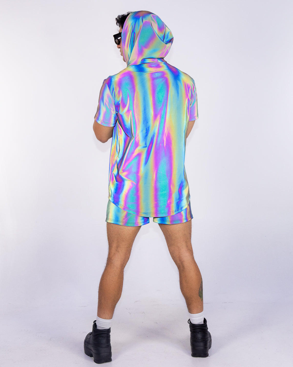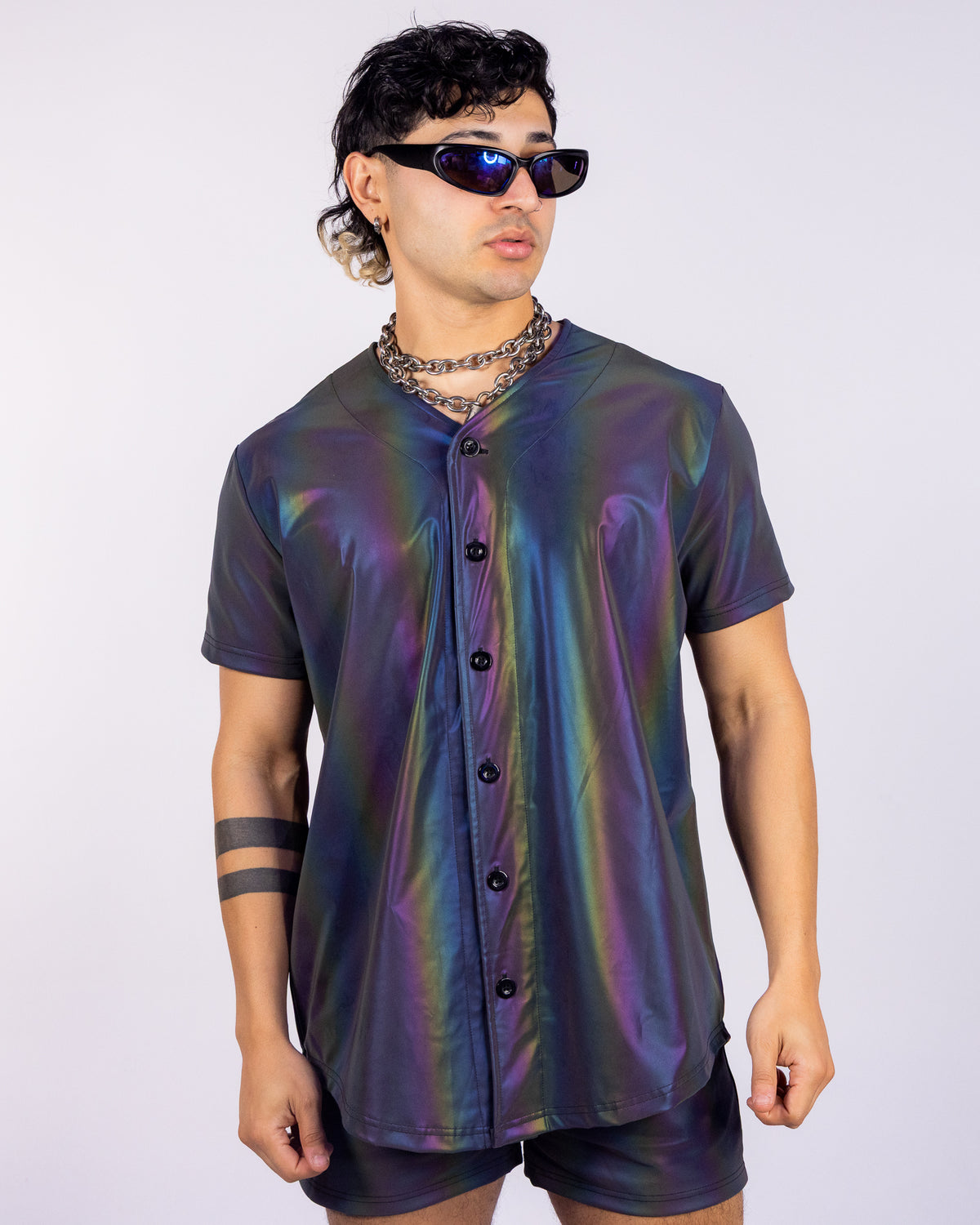 Stand out and take risks with our Rainbow Flash Reflective Jersey. Made with flash reflective material, this button-up jersey design will light up in the night at any rave, concert, or music festival. Be bold and adventurous with a jersey that will make you shine.