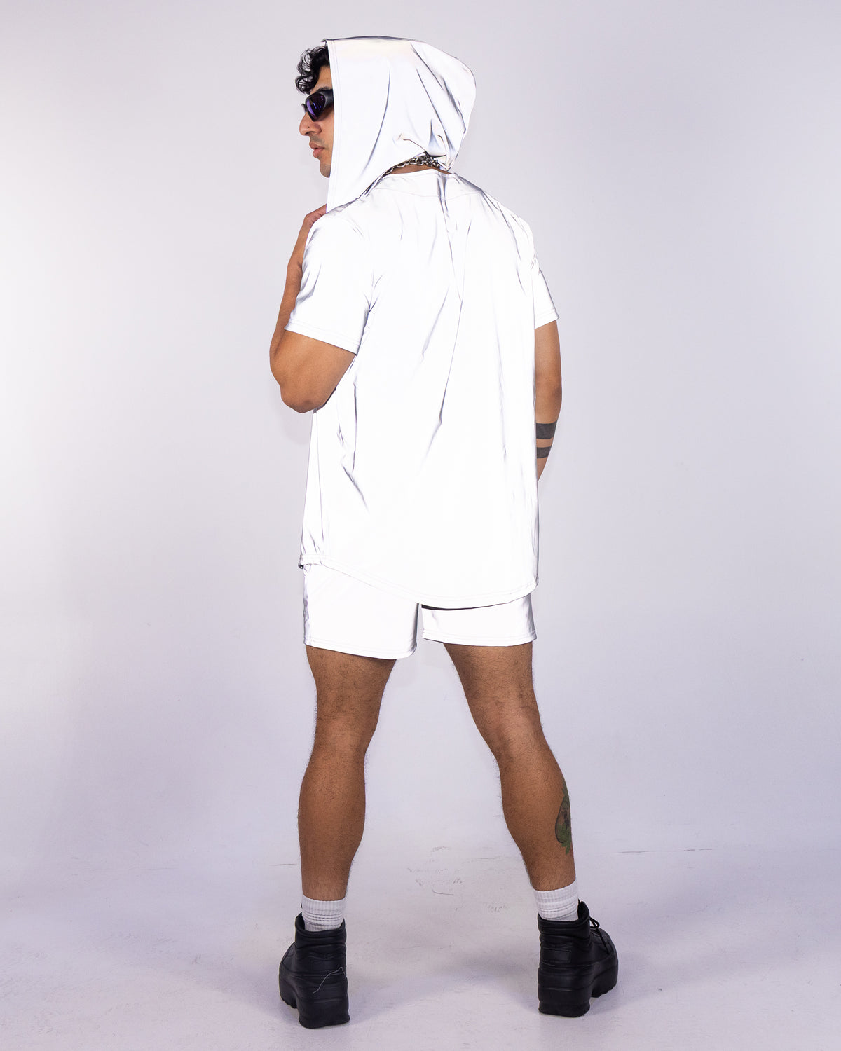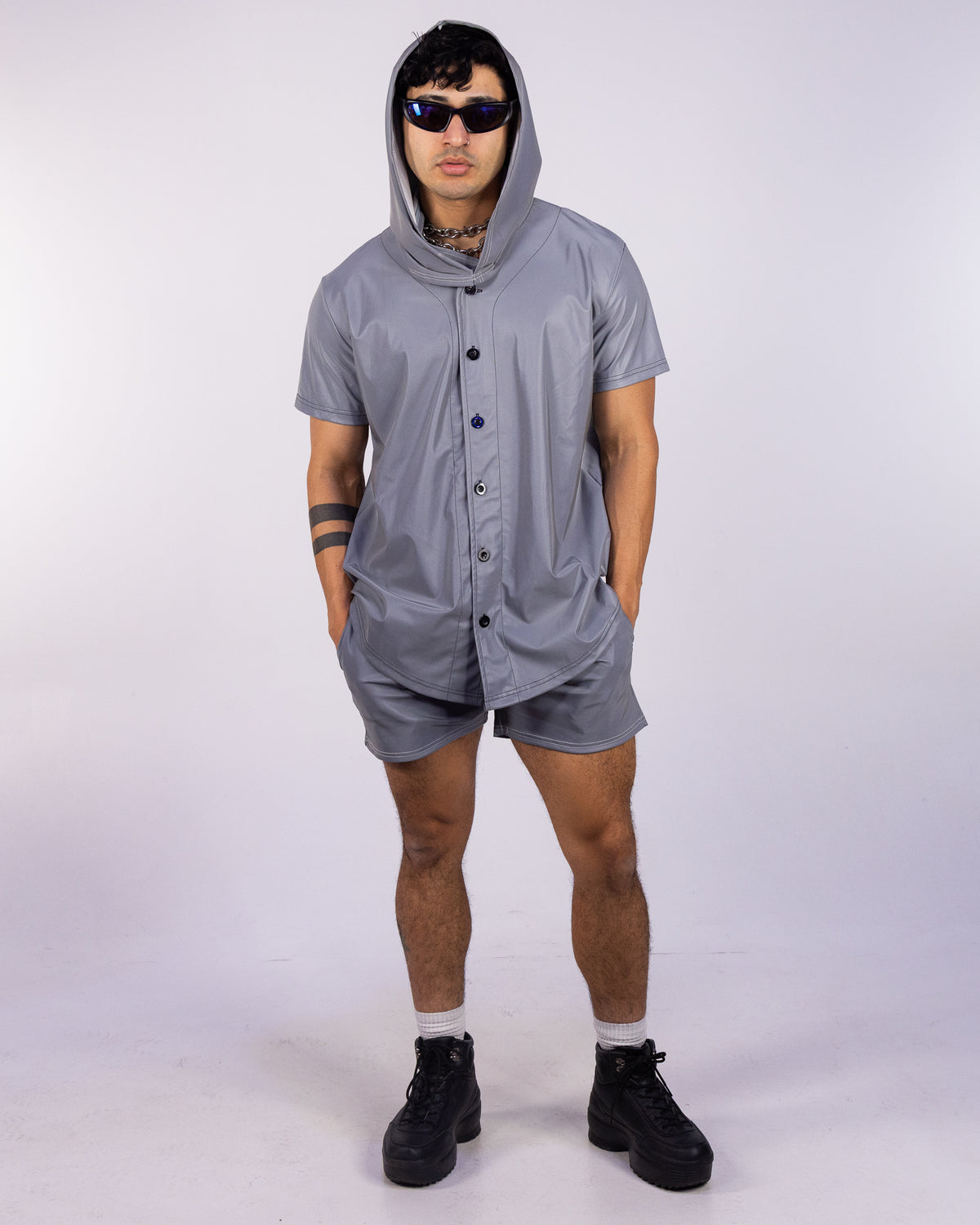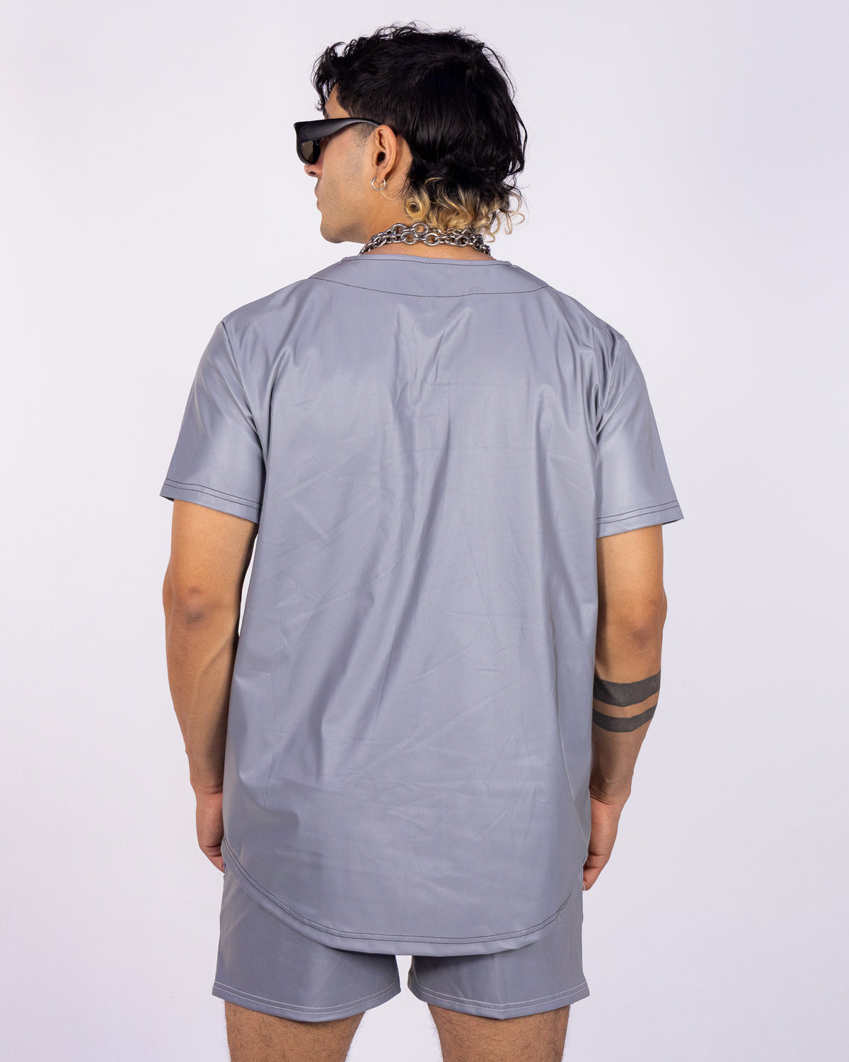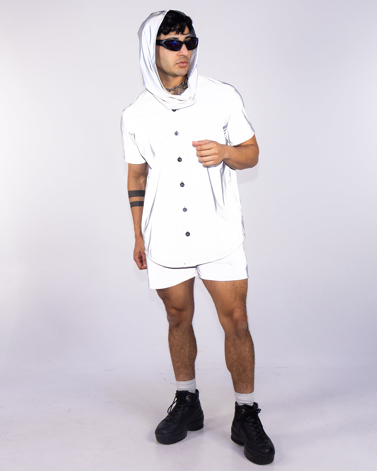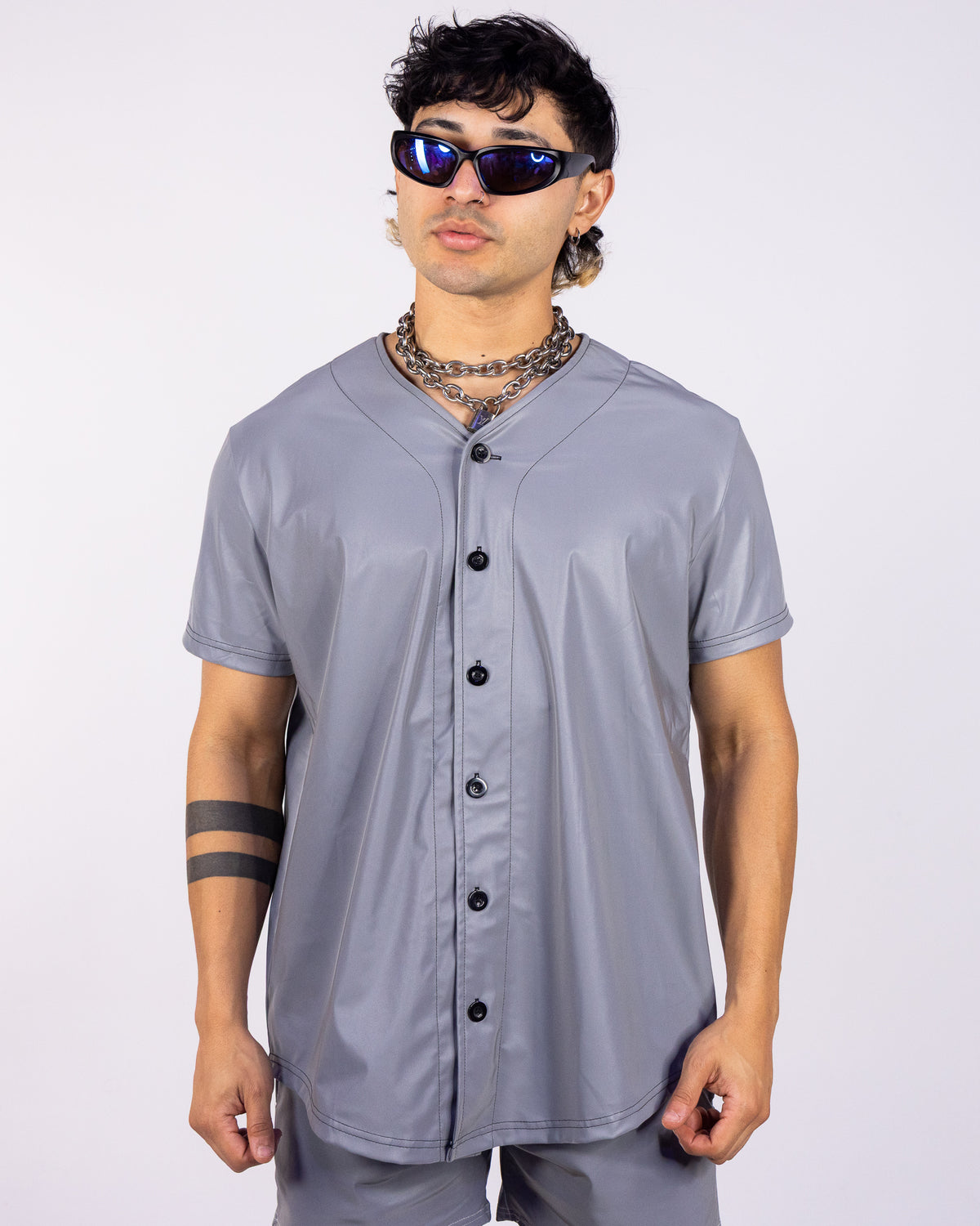 Stand out and take risks with our Silver Flash Reflective Jersey. Made with flash reflective material, this button-up jersey design will light up in the night at any rave, concert, or music festival. Be bold and adventurous with a jersey that will make you shine.
