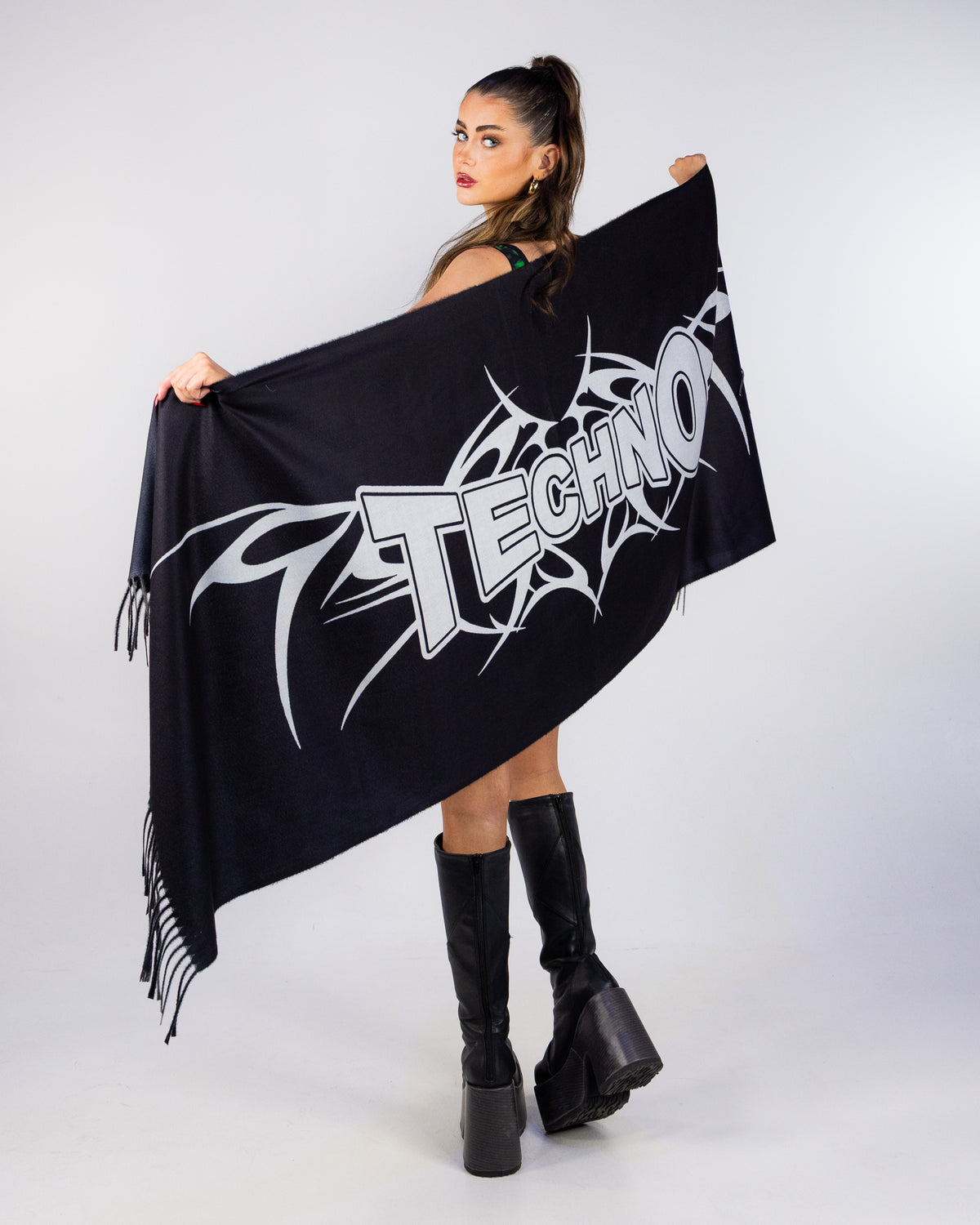 Show off your bold vibe with this Techno Unisex Black Pashmina. Featuring striking white lettering on deep black fabric, this pashmina brings an edgy statement to any outfit. The tassel fringe adds movement and flair, perfect for making an unforgettable impression at festivals or nights out. Embrace your favorite genre with style and attitude.