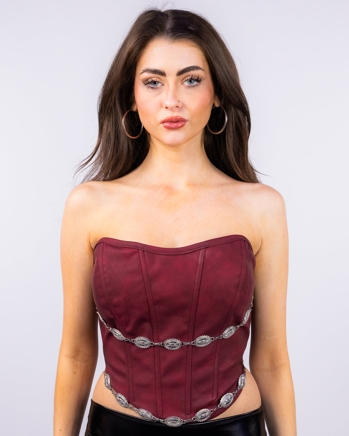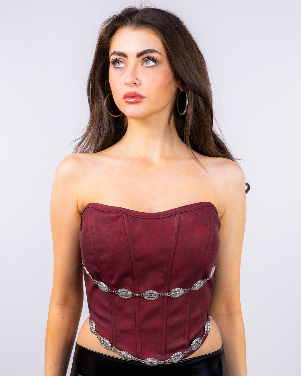 Unleash the inner rebel in you with our Maroon Minded Women's Corset Top! This distressed red PU leather top features a strapless sweetheart neckline, boned panel construction, and an asymmetrical curved hemline for an edgy look. Complete with silver western embellishments and an adjustable satin lace tie at the back, this top is perfect for any adventurous festival or Coachella & Stagecoach outfit. Let's rock the stage!