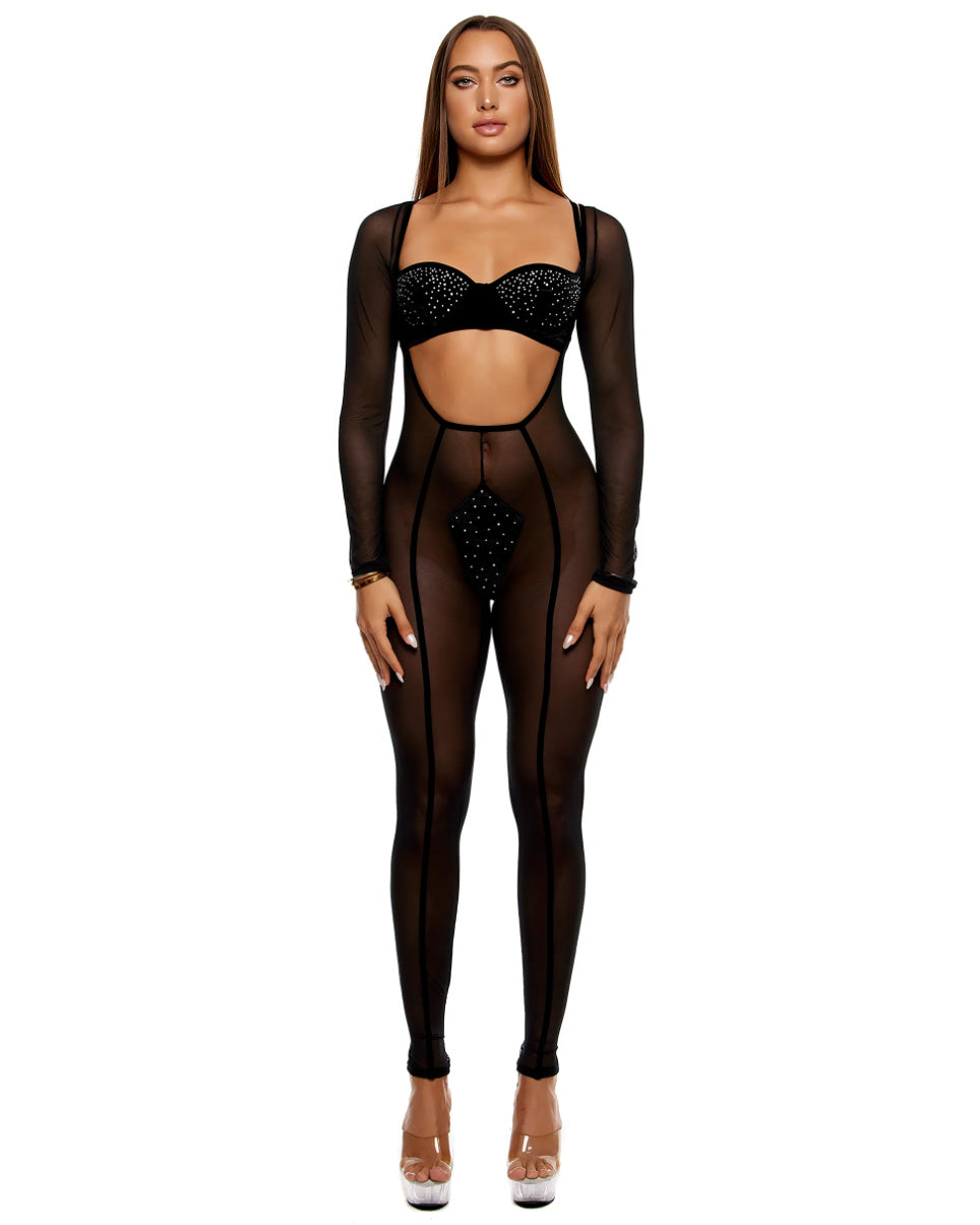 Introducing the Caught Your Eye Women's Black 2pc Jumpsuit Set - a 2-piece velvet rhinestone bra and jumpsuit set for the bold and daring. Featuring sheer mesh panels and a keyhole cutout at the back.
