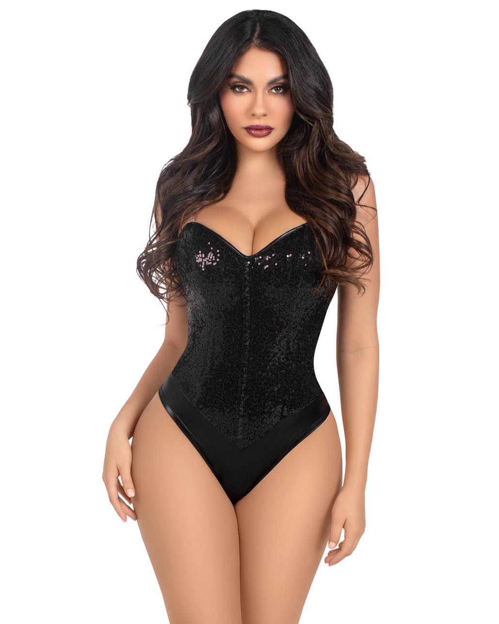 The ultra-sexy women's sequin bodysuit features a boned front and zipper back, with a bat-wing bodice detail that's perfect for sexy costumes and daring role play looks.