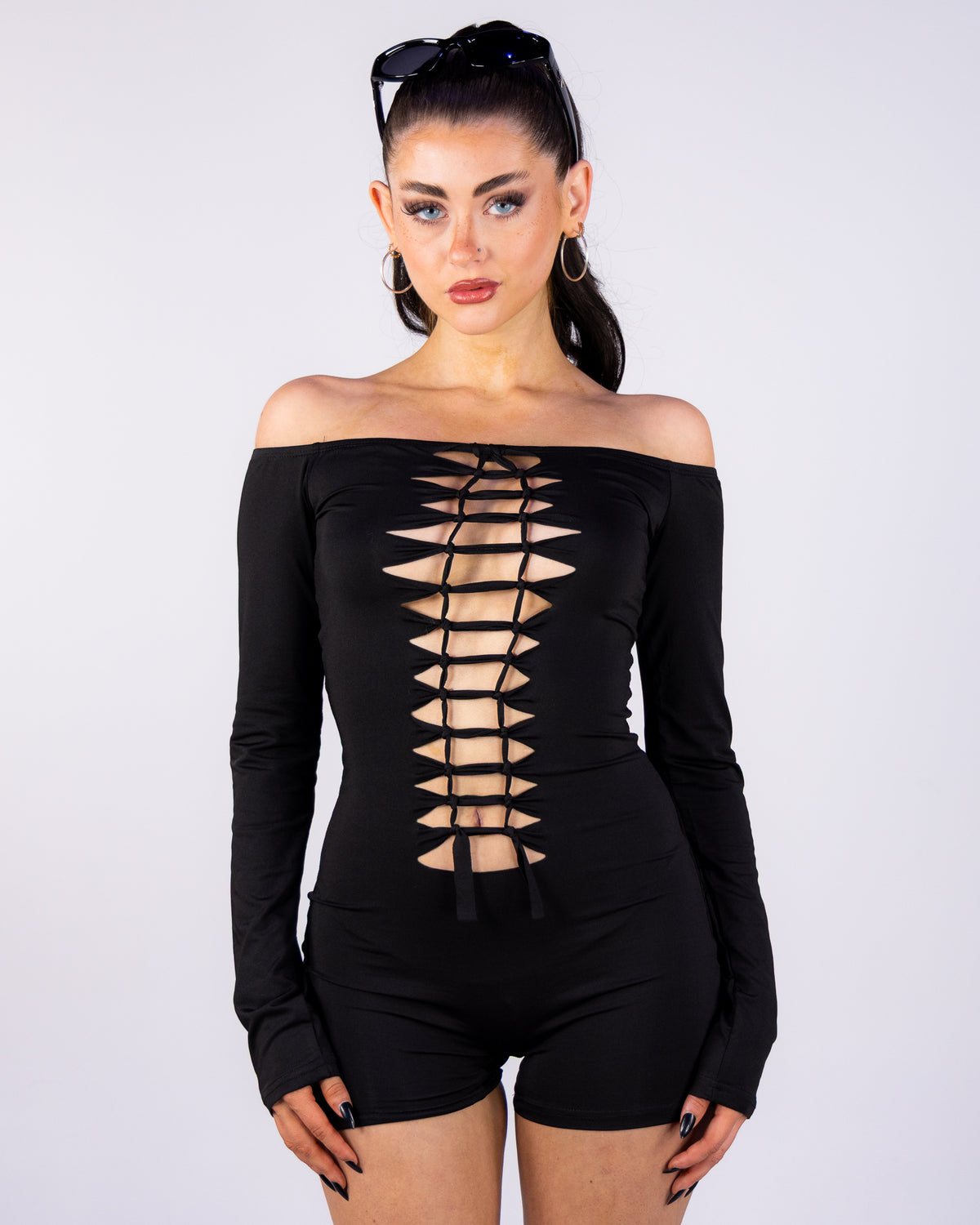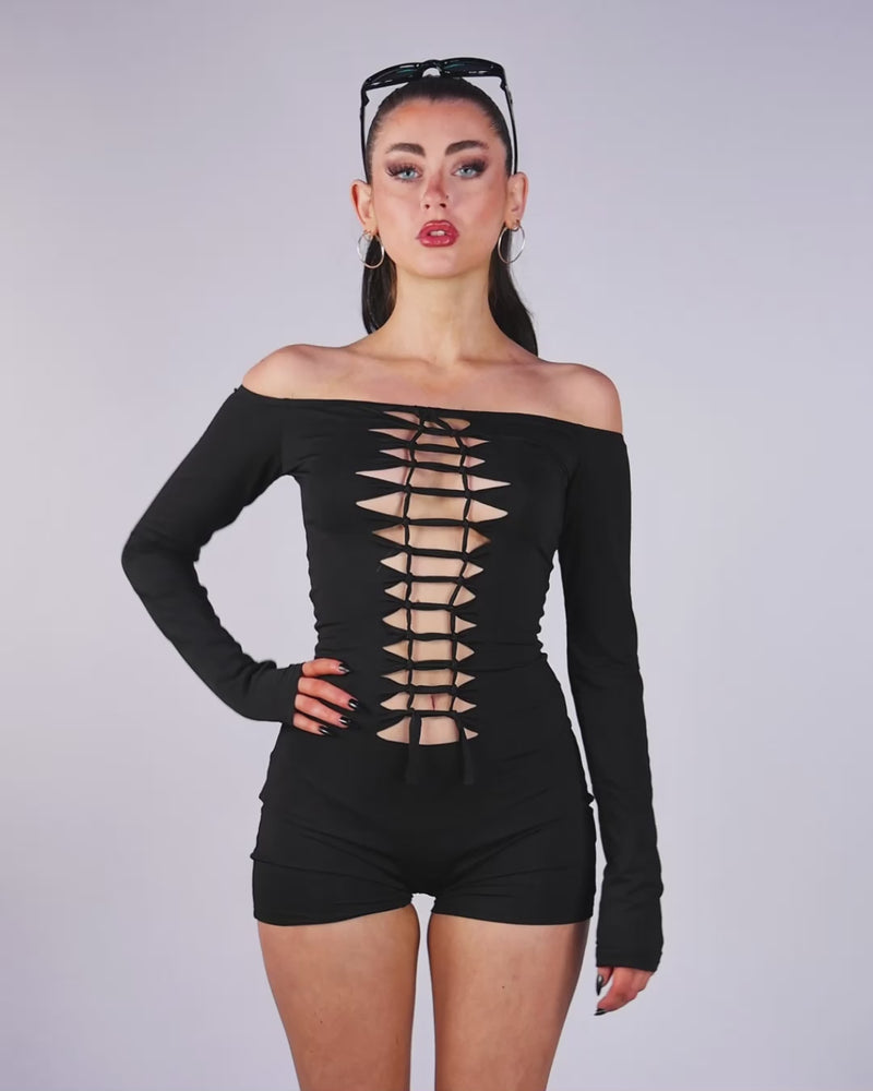 The Cold Hearted Women's Black Braided Romper is your ultimate statement piece for unforgettable nights. Its off-shoulder silhouette and long sleeves create a sleek, daring look, while the intricate braided cutout design on the front adds a striking, provocative edge.