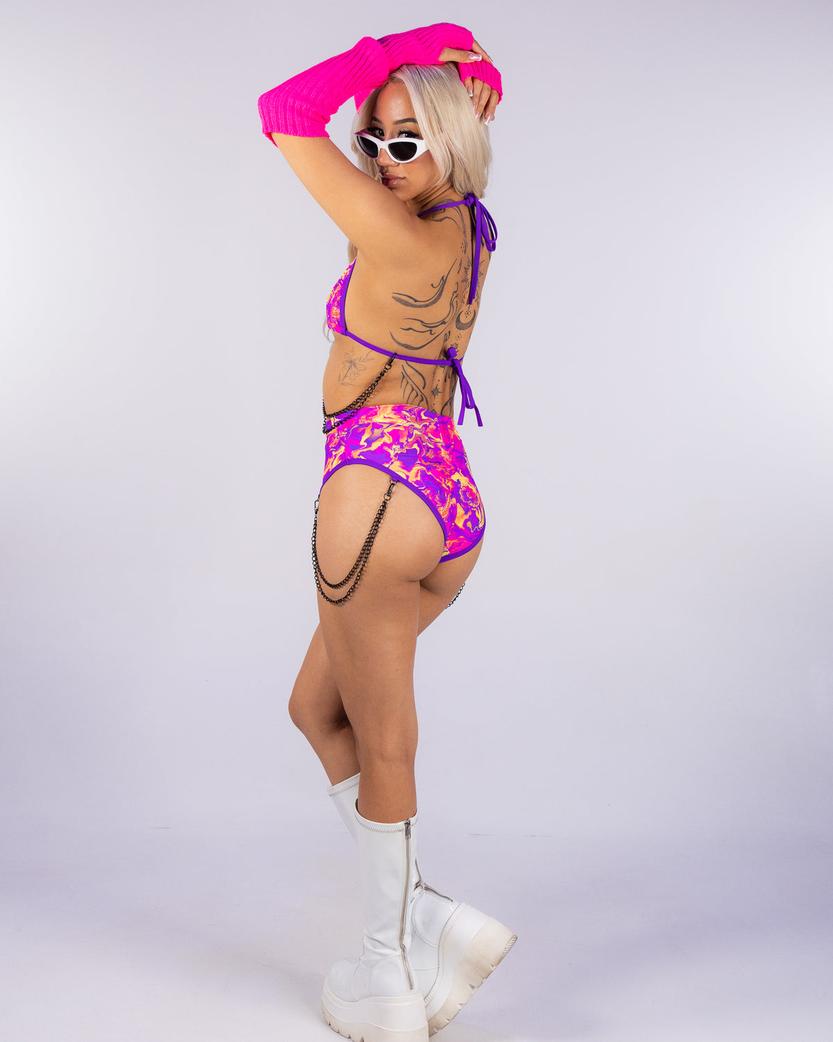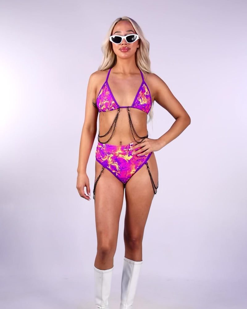 This classic bikini top features detachable chains giving you the freedom to get creative and customize the chains to your liking! The halter ties around the neck and back allow for an easily adjustable fit.
