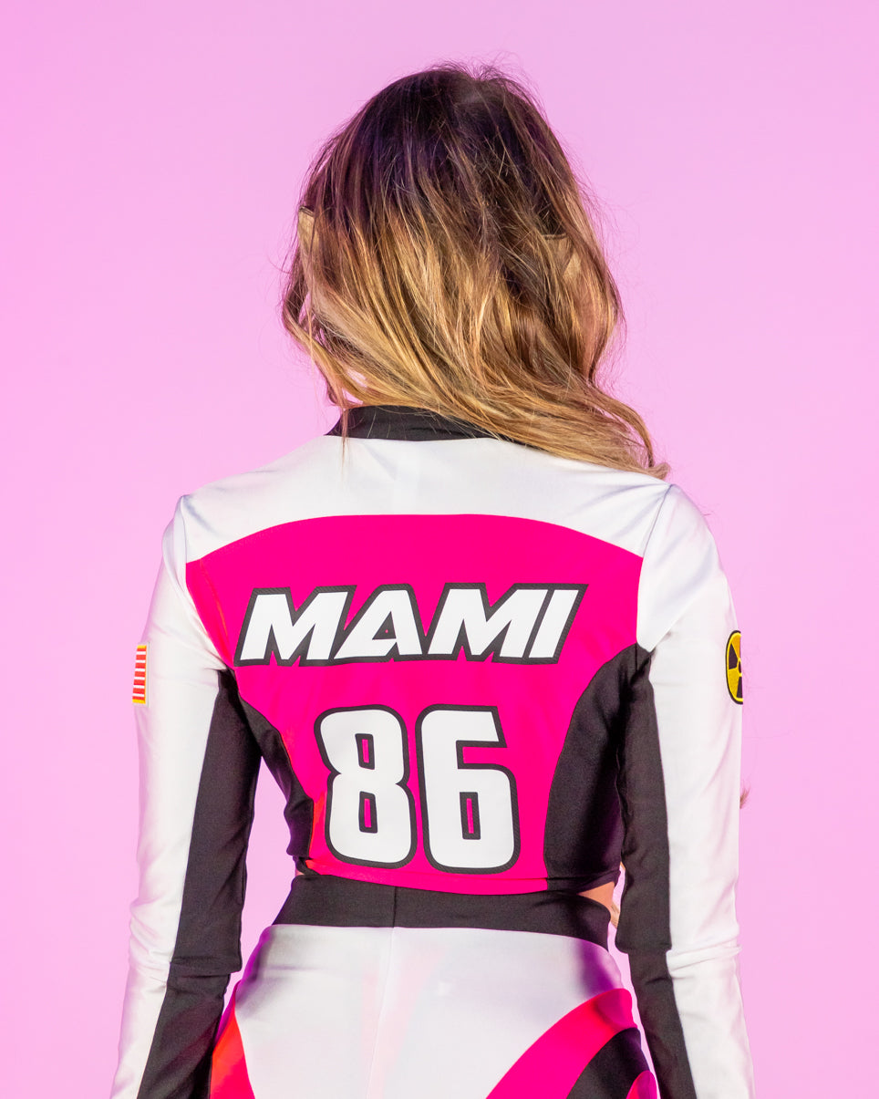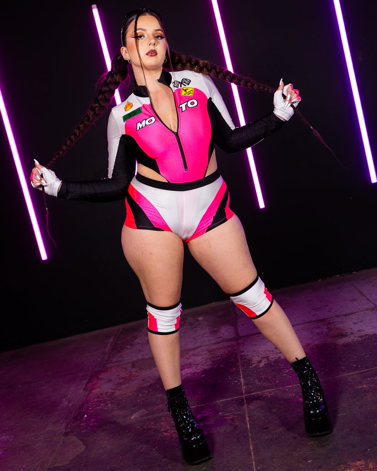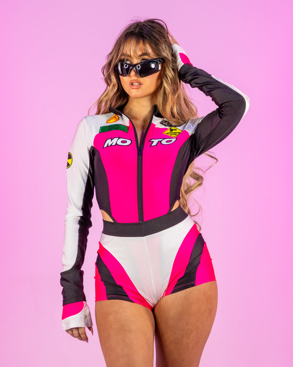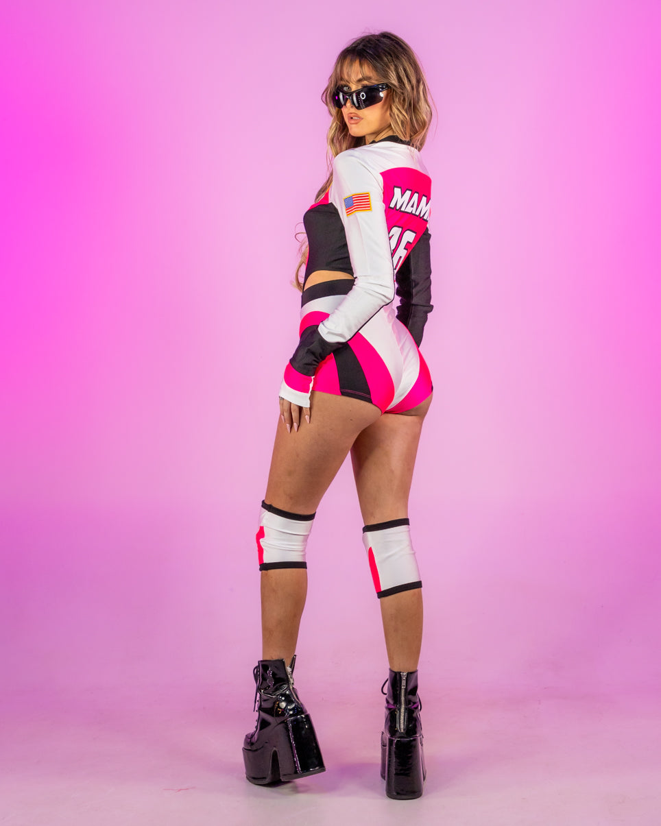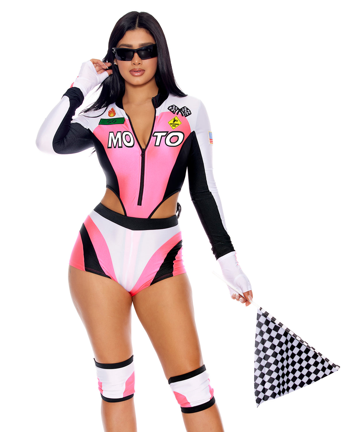This 5-piece sexy motocross racer costume features high cut long sleeve mock neck zip front bodysuit with "MOTO" print and ornamental racing patches paired with matching shorts and knee bands and gloves and glasses.