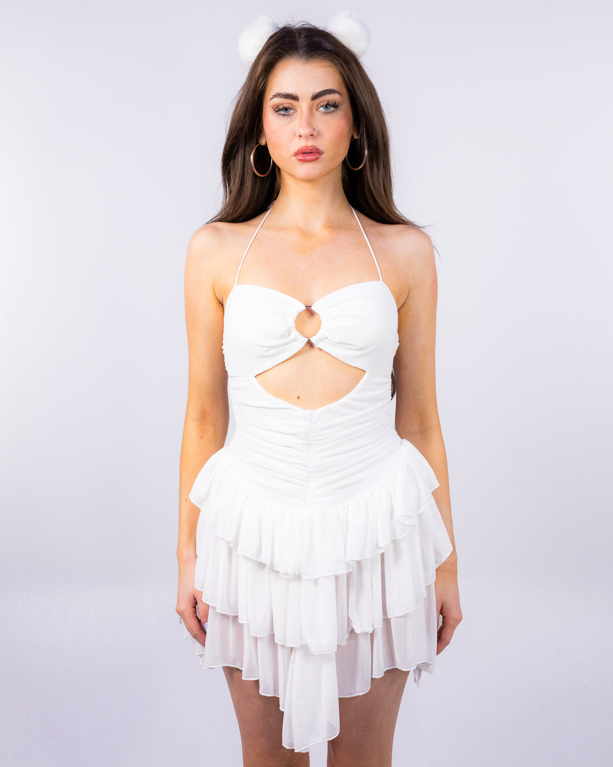 Step out of your fashion comfort zone with our Awe Struck White Dress. This halter cutout mini dress features an o-ring hardware detail with sheer ruffle details and spaghetti straps to show off your daring side. Whether you're heading out for a night on the town or dancing under the stars at a music festival, this dress will keep up with your every move. So why not add some adventure to your wardrobe and channel your inner wild side today!