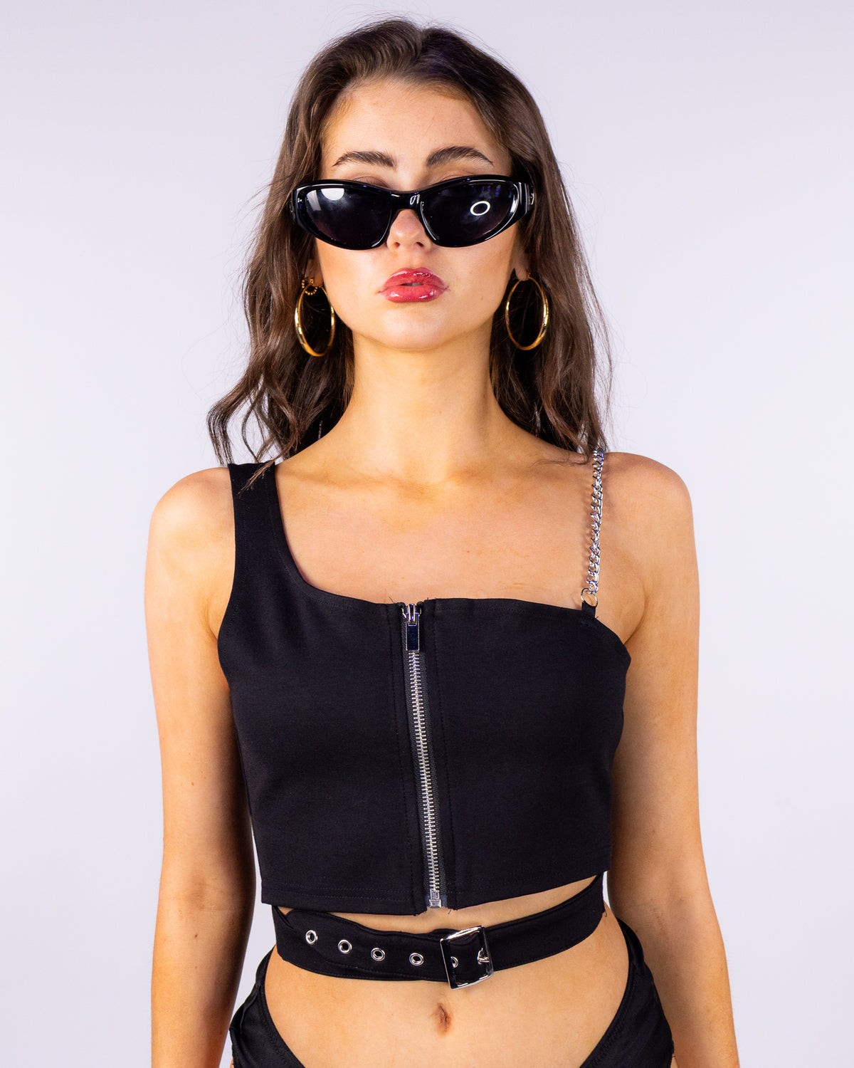 Unleash your inner rebel with this provocative black crop top featuring a bold front zipper closure and seductive waist cutout with adjustable buckle strap. The edgy chain spaghetti straps add a dangerous metallic accent that demands attention. Versatile enough for daily defiance or festival domination – this top is your weapon of choice for turning heads and breaking hearts.