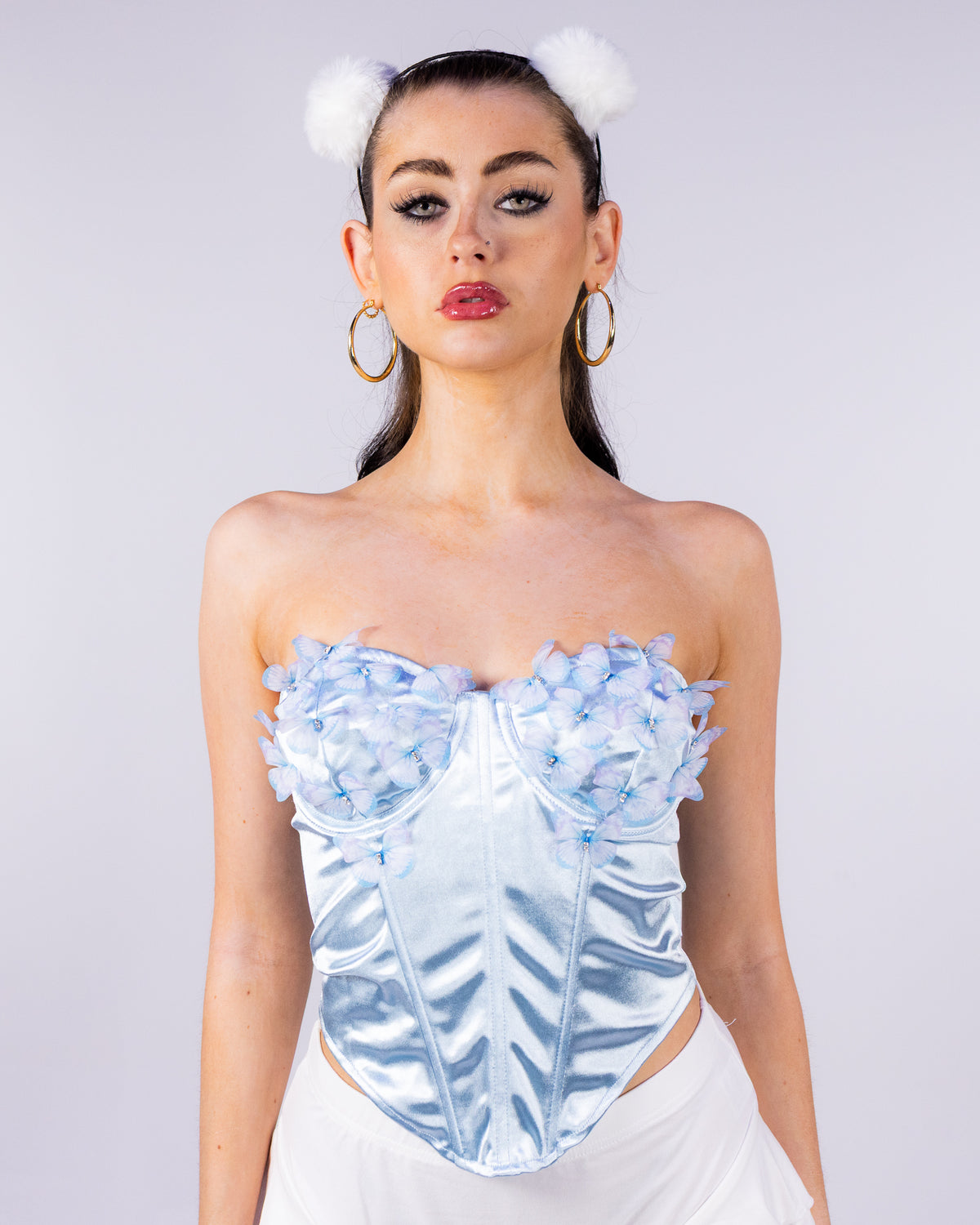Take your style to the next level with our Satin Butterflies Women's Corset Crop Top! With its flirty corset design accented by butterfly appliques along the neckline, this strapless baby blue satin corset top is perfect for making a bold statement. Don't settle for ordinary, be the risk-taking trendsetter you were meant to be with this edgy and chic top.