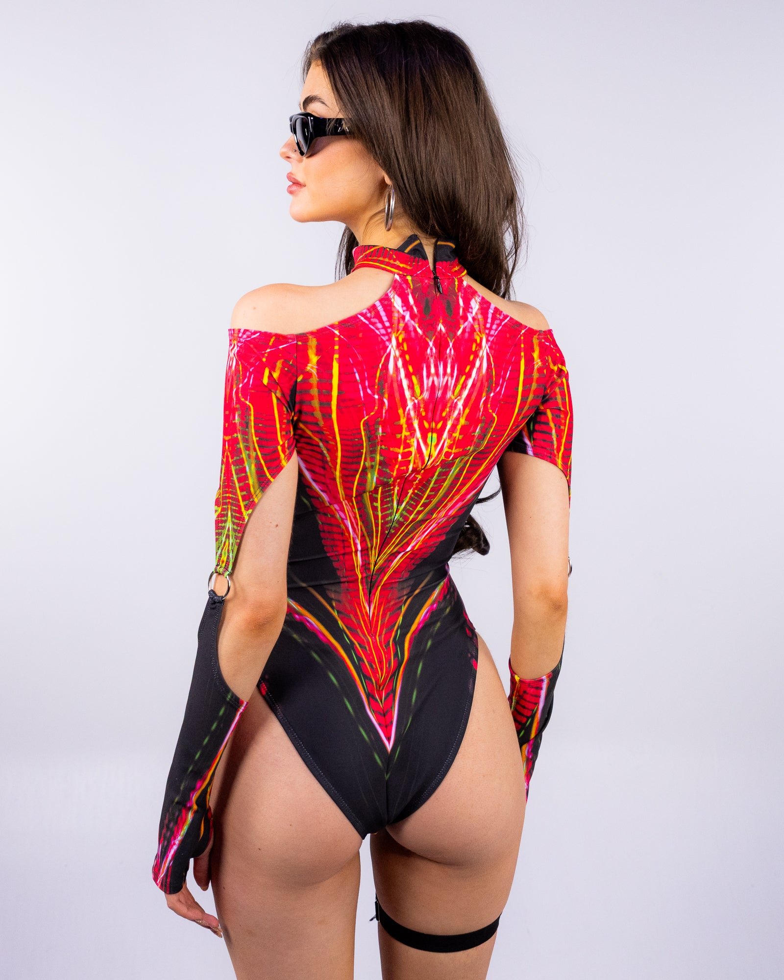 You can never go wrong with black and a bold neon color palette. Complete with a limited edition print, this bodysuit propels you into a state of seduction, while the cutout long sleeves and high neck gently conceal and sculpt your figure. As far as styling goes, this piece can do it all - go from daytime walks around camp grounds to a midnight trance surrounded by the crowd.