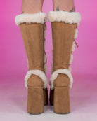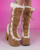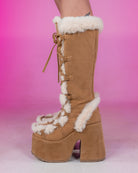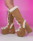 5" (127mm) Chunky Heel, 3" (75mm) Platform Lace-Up Knee High Boot Featuring Faux Fur Trim Detail, Full Inner Side Zip Closure. Vegan suede.