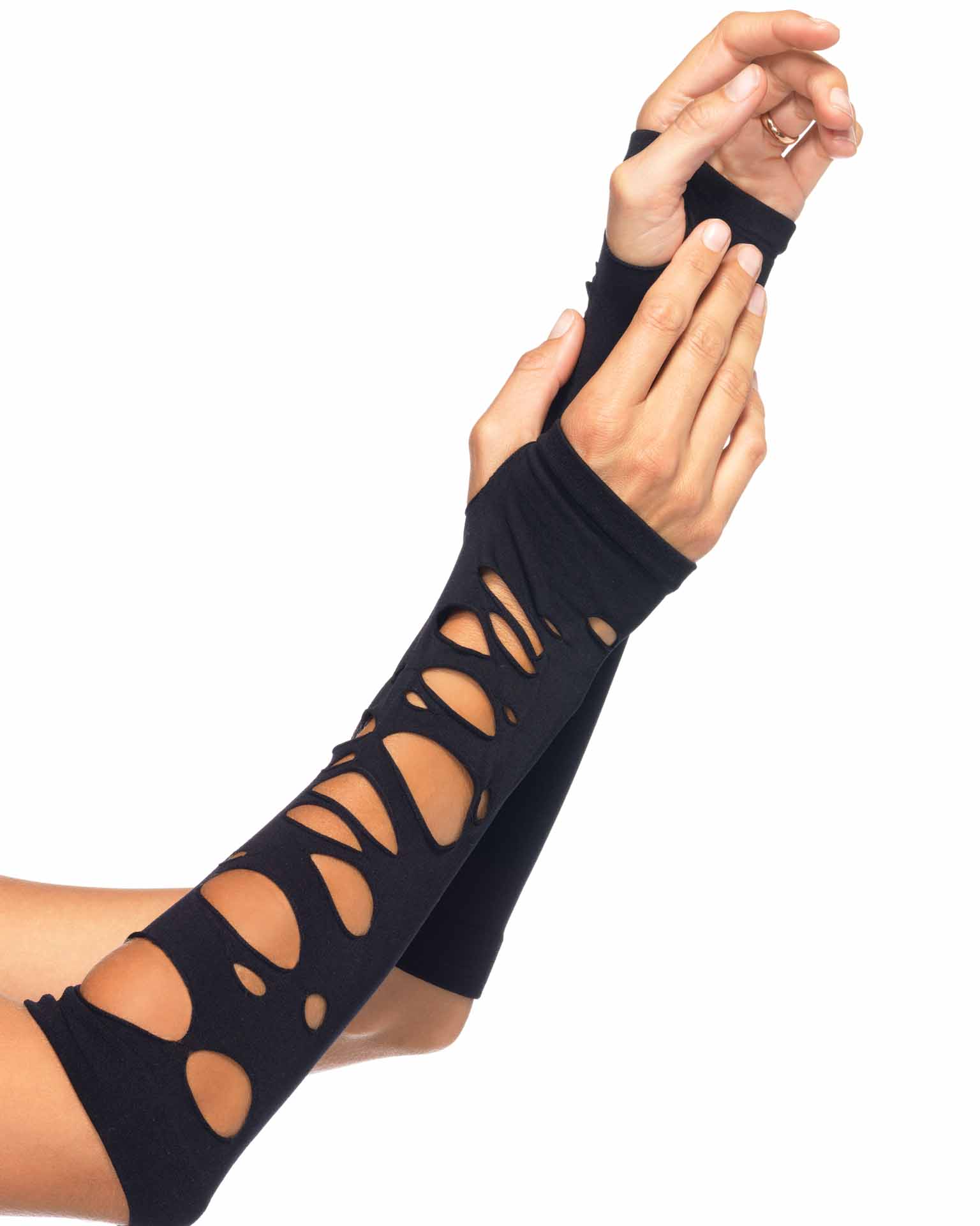 The costume gloves feature a distressed pattern, fingerless design, and elbow length.