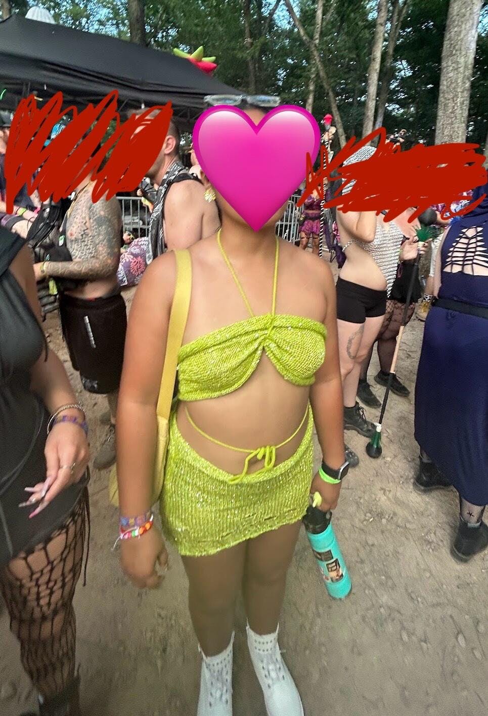 - Includes crochet & sequin top, shrug, & matching drawstring skirt