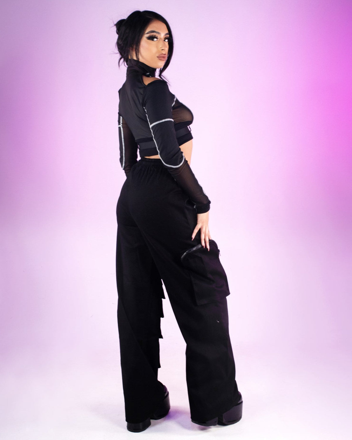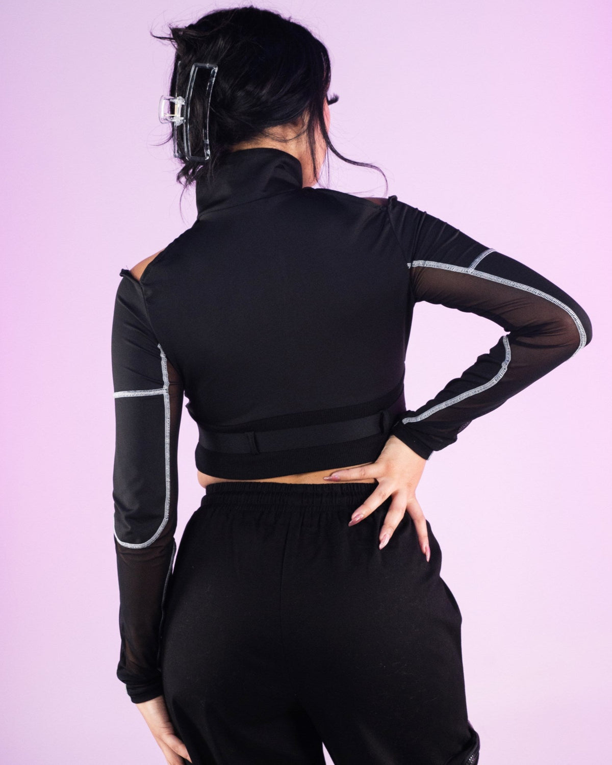 Step into the spotlight with the High Tech Women's Black Long Sleeve Crop Top, designed to amplify your rave wardrobe with a bold, futuristic flair. This daring piece features a sleek mock neckline that frames your look with modern sophistication, while strategically placed mesh panels add an edgy, breathable touch perfect for high-energy nights.