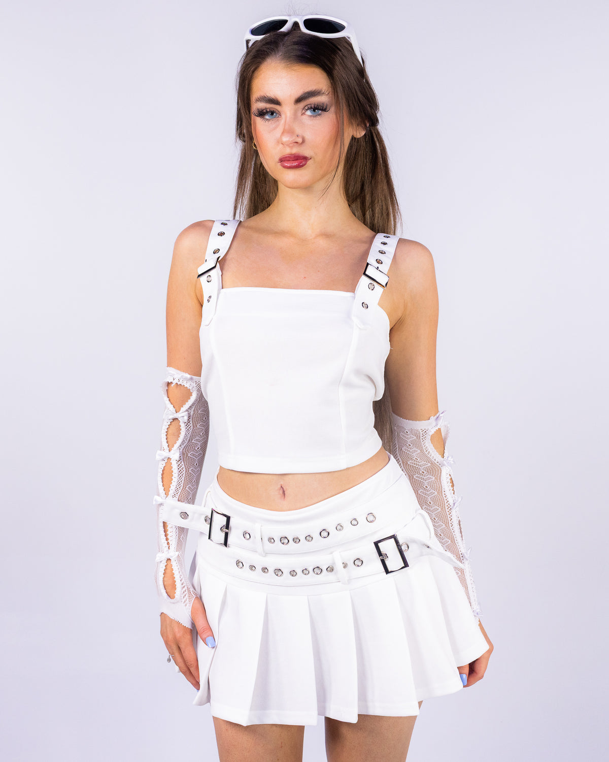 Get ready to add some playful charm to your wardrobe with the Luxe Class Women's 2pc Skort Set. Featuring a sleeveless crop top with buckle detail on the shoulder straps and matching pleated mini skirt, this set is truly perfect for any occasion. Whether you're dressing it up for a rave or keeping it casual for everyday wear, this set is sure to turn heads!