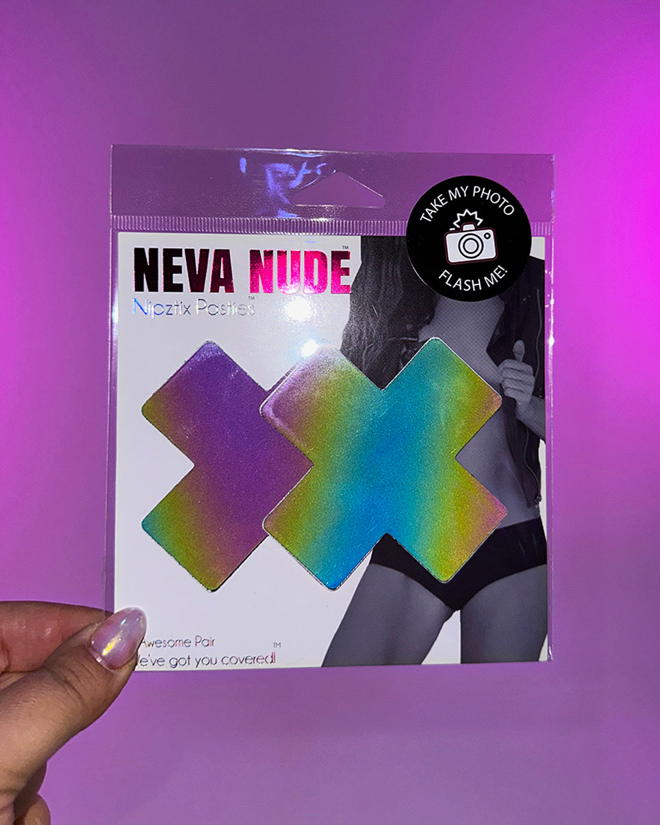 This shit is FLASH REFLECTIVE! Take a pic with yr flash on to show off that flash!! Each pack includes 2 Neva Nude pasties.
