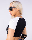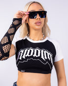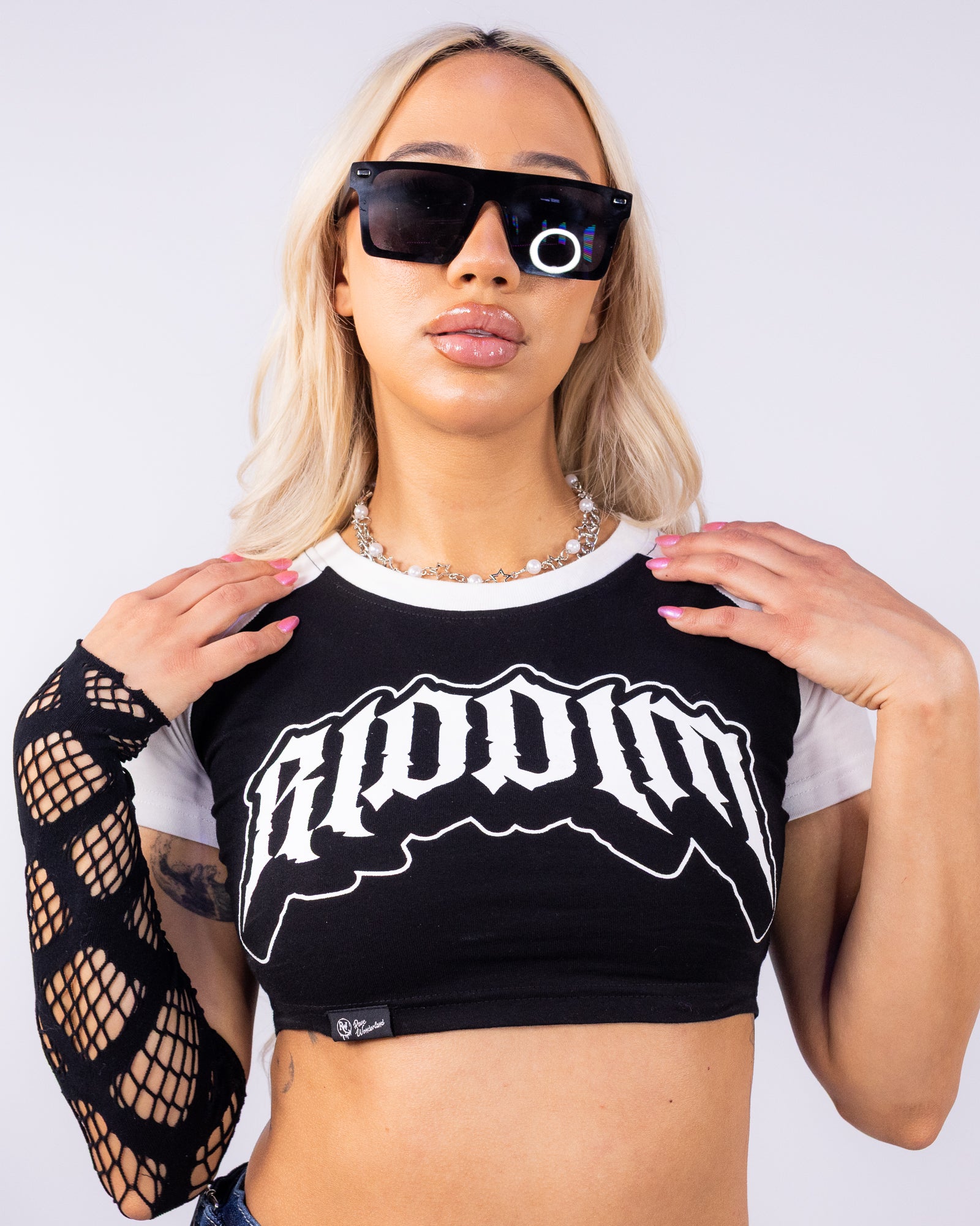 This top is for the babes who love the wubz! This black baby tee with white sleeves make it so easy to dress up or down and pairs with any color combo. Perfect for everyday wear or dancing the night away at the rave or underground, this baby tee has got you covered!