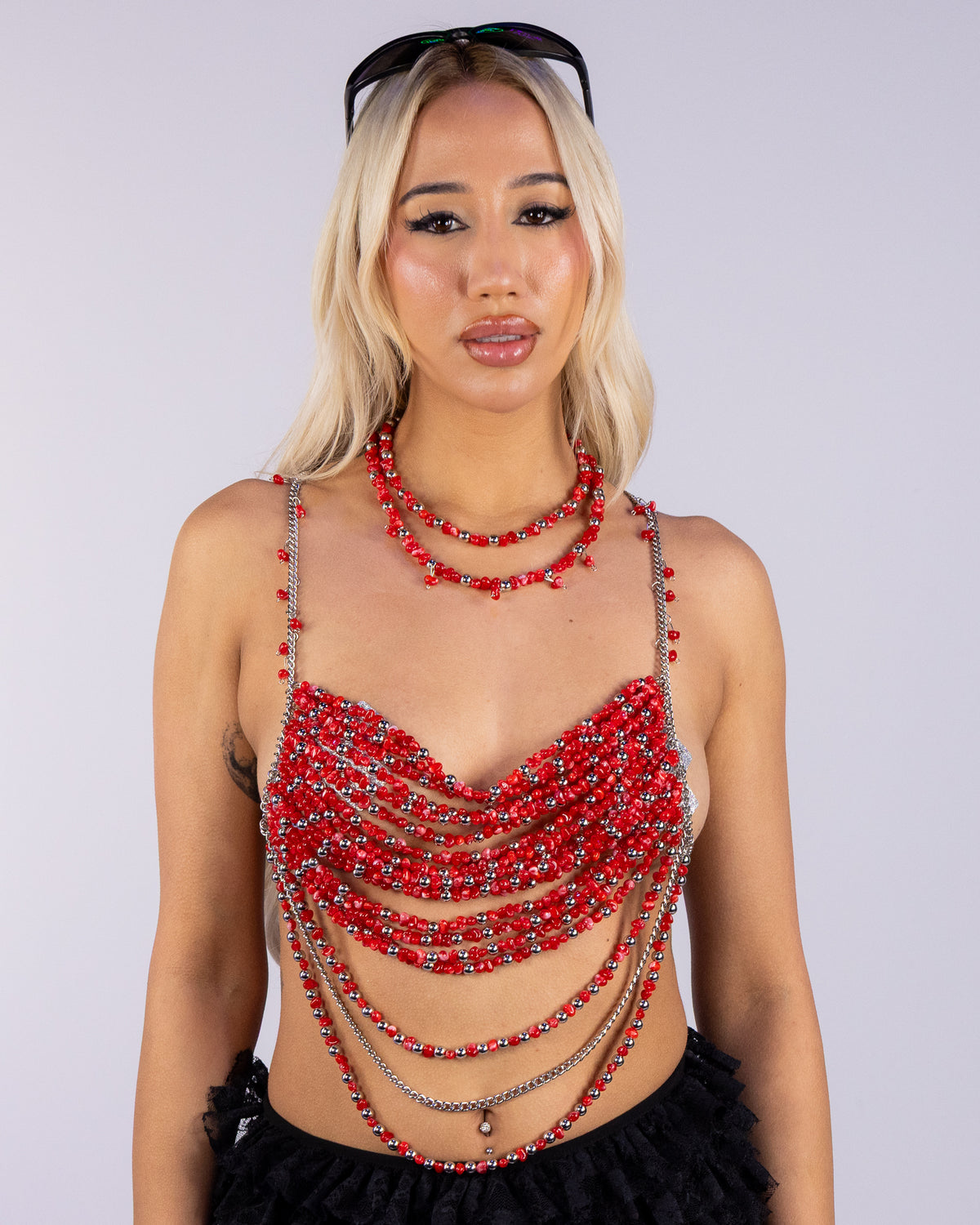 Transform into a shining star of the dance floor with the Scarlet Heart Women's Red Bead Top. Embrace your individuality and mesmerize the crowd with this bralette top adorned with red bead strands and accented with cascading beads. The lobster-claw closure makes it easy to adjust for a comfortable fit, so you can dance the night away without worry. Get ready to stand out from the crowd at any rave or music festival and exude confidence at any festival or rave!